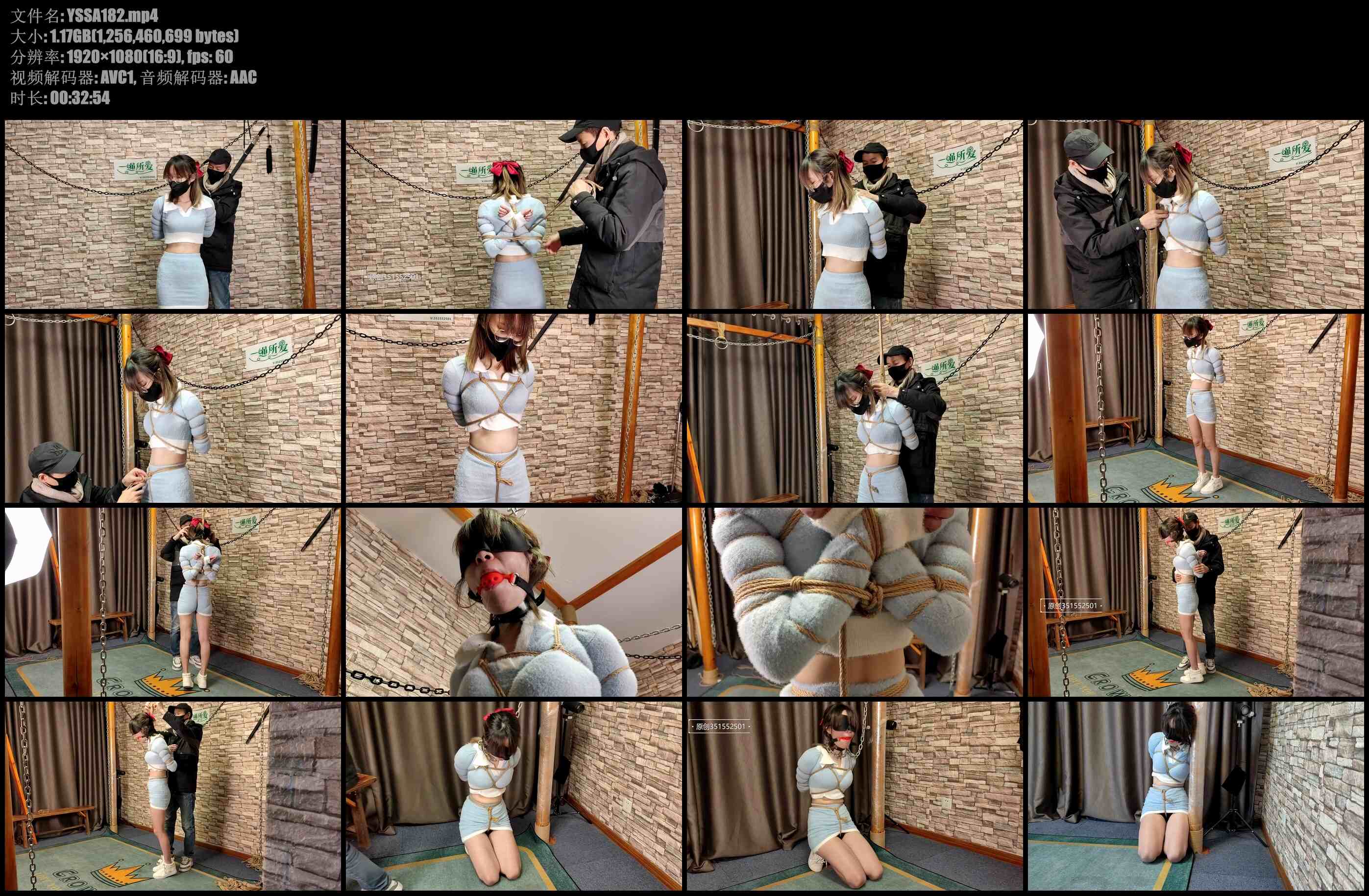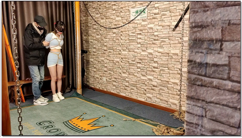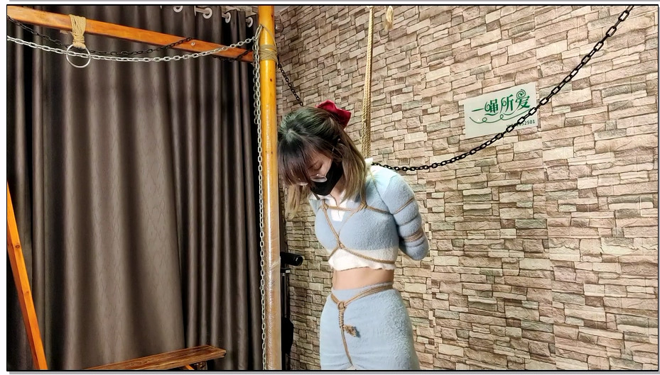 一绳所爱 喵喵素衣五花紧缚,双手提到最高点,蒙眼堵嘴欺辱,最后脖子被铁链锁在柱