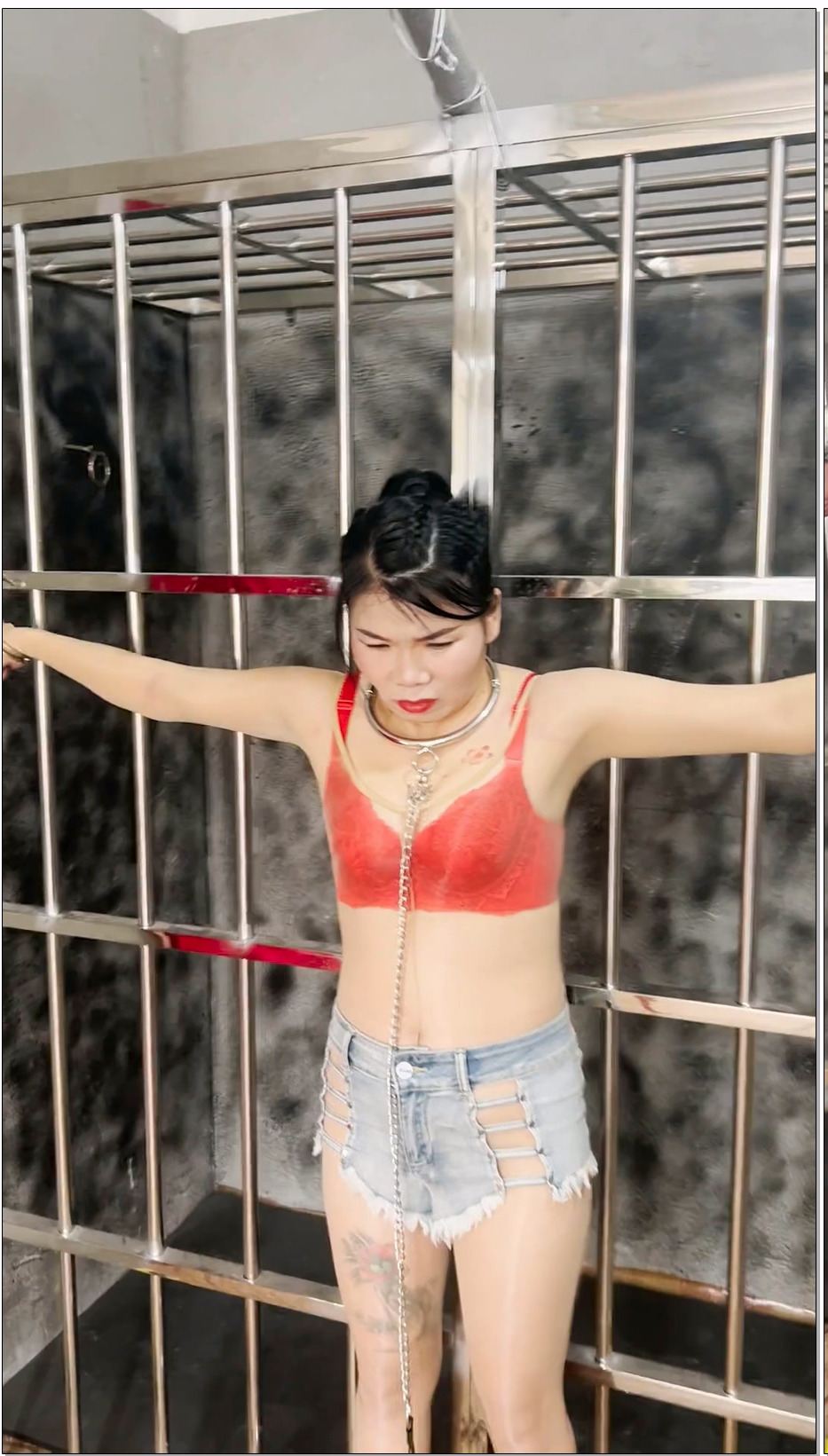皖北绳艺 某手几十万粉丝网红、白衬衫、高马尾、红底高跟。为艺术献身,铁笼里被囚
